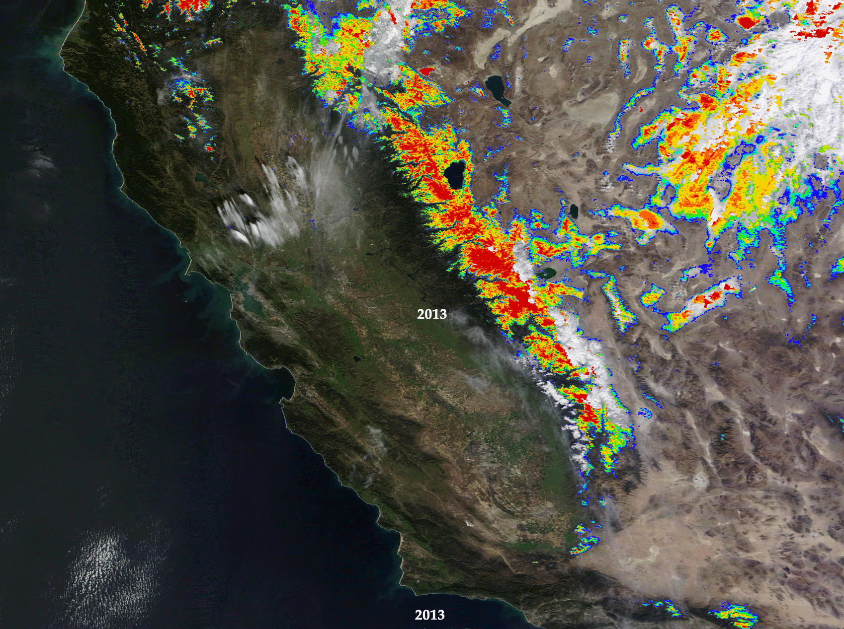 An animation of images acquired by NASA's Terra satellite shows the evolution of snowpack in California's Sierra Nevada range in late February for each of the four years since 2013. Color-coded snow-cover data comes from the satellite's MODIS instrument, with red showing the highest percentage of snow cover and blue the lowest. (Imagery: NASA. Animation: Tom Yulsman) | See update below. Synopsis: Since I published this post, forecasts have been firming up and suggesting a shift toward wetter conditions in March. Will it be enough? Please keep reading, and check out the update at the end...