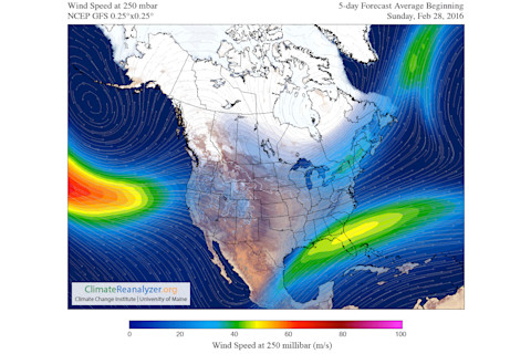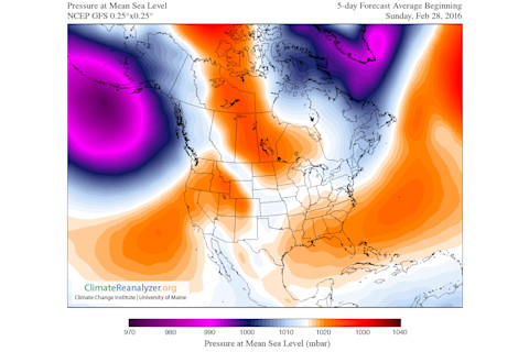 The five-day forecast starting Sunday, Feb. 28, 2016, for the average jet stream wind speed. (Source: Climate Reanalyzer) See that bright tongue entering from the left? That's the jet. And as you can see, the highest wind speeds peter out before they get to California. That has been the pattern as of late. What's going on? One factor is a fairly persistent ridge of high pressure parked over the eastern Pacific and California. Here's what the five-day forecast for that ridge look like: