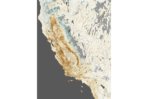 Thus begins chapter 1 of "The West Without Water" by Lynn Ingram and Frances Malamud-Roam, a book that delves into 20 millennia of climate history to give us some insight into what we are experiencing in the Western United States now, and what we might need to prepare for in the future. It's an apt quote to go with the animation above — a before and after look at the continuing epic California drought. Each frame consists of data from NASA's Terra satellite. The first was captured on Feb. 15, 2013, when the snowpack in the Sierra Nevada mountains (which run from upper middle to lower right) was 72 percent of normal for the date. That was low and worrisome. On that date, a little less than 50 percent of California overall was suffering from some degree of drought, according to the U.S. Drought Monitor. None of the state was in extreme or exceptional drought, the highest two categories. Fed in large measure by irrigation water, the vast Central Valley just to the west of the mountains — one of the prime agricultural regions of the nation — was still relatively green. Flash forward a year to this past weekend — Feb. 16. That's the second image in the animation. The snowpack in the Sierra is visibly diminished. As of today, measurements show that it stands at just 26 percent of normal. This is despite recent storms. (If you'd like to check on current and past California snowpack conditions, go here.) And as of Feb. 11 of the current year, the Drought Monitor found 95 percent of California to be drought, with 70 percent the state categorized as in extreme or exceptional drought. As a result, vegetation throughout the state is suffering, including in the Central Valley. NASA scientists have used data from the MODIS instrument on the Terra and Aqua satellites to map where greening from plant growth is below normal for this time of year: