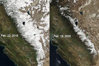 As the comparison of satellite images above shows, last year at this time California's Sierra Nevada range was buried in snow. And even as recently as January of this year, snowpack was looking pretty good.