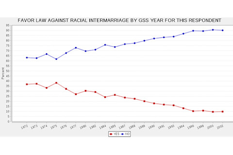 That's the number. At least according to Public Policy Polling. That seems rather high. So I decided to go back and look at the RACMAR variable in the General Social Survey. Here's the question: