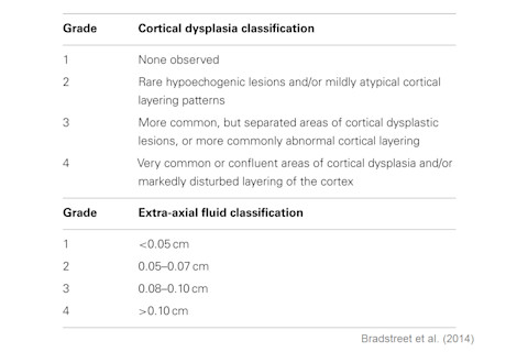Bradstreet et al. report finding two kinds of abnormalities in the children with autism. Firstly, there was an increased thickness of extra-axial fluid (EAF), a fluid-filled space between the arachnoid mater and the pia mater, two of the meninges. Secondly, there was cortical dysplasia - structural abnormalities in the cortex itself - namely "hypoechoic lesions within the substance of the cortex, or disturbed layering within the gray matter." The authors rated these abnormalities on a 4-point scale, with 1 being no visible abnormality and 4 being severely affected.