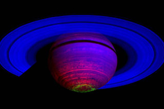 The infrared auroras show up in green in this false-color composite from NASA's Cassini spacecraft, stitched together from 65 individual observations taken by the probe's Visual and Infrared Mapping Spectrometer in 2008. According to a NASA news release, the auroral light appears in the near infrared at wavelengths of three to four microns. Blue designates reflected sunlight at two microns, and red represents thermal emissions at five microns. [Scientific American]