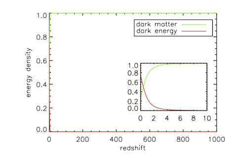 Today is very, very near where the two lines cross (redshift=0 is today; redshift=1,000 is where the CMB is generated; the Big Bang is at redshift=infinity). You can't even see the crossing on the main plot; you need to go to the inset to see the incredibly rapid change at redshift=1. Last week at the Yukawa Institute workshop John Moffat was advocating calling the standard model "anti-Copernican" because of this fine-tuning. He has been wanting to take matters one step further: if we are willing to break the Copernican principle in time, why not seriously consider breaking it in space instead? More on this later. The Copernican principle is one of those weird things in science that is a mix of science and aesthetics. It can't be written down as an equation. And its application is often subject to the eye of the beholder. For example, the plot above looks like a problem because we've used redshift on the x-axis to represent time. There are physically motivated reasons to use this, as it relates to the size of the Universe, and is thus a proxy for many relevant physical processes. If instead we label time the way we normally measure it (as in, on your wristwatch, if you happened to have been around since the Big Bang), you get something that looks much more reasonable: