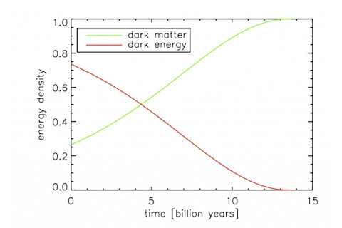 We're no longer at a special time, and the coincidence problem vanishes. The Universe has been dark-energy dominated for billions of years, and we're nowhere near the special crossing point. So which plot is right?