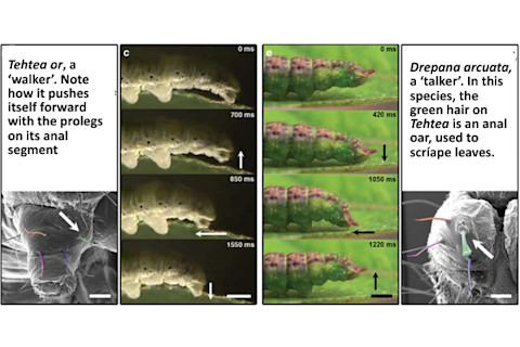 are made by tendons that slide as a natural part of their gait. Often, these origins are hard to test and scientists need to be careful if they aren’t to rely on fanciful just-so stories. To avoid that, Scott analysed 36 species of caterpillars from two different families. Some of them had simple struts called “pro-legs” on their end segment, which they use to inch their way along. Other species lacked these structures and in their place, they had a pair of “anal oars” – thicker, harder, spatula-shaped versions of the caterpillar’s normal hairs. These are the instruments that the larvae use to scrape their leaves. These two groups of caterpillars put their bums to different uses – walking and talking – but the movements they make are the same. They lift the anal segment forward, place it on the leaf and their push backwards against it. The big difference is that in the walkers, the end stays put and the front half launches forward, while in the talkers, the front stays attached and the bum moves backwards. When the masked birch caterpillar makes its anal scrapes, it is essentially talking by walking on the spot.