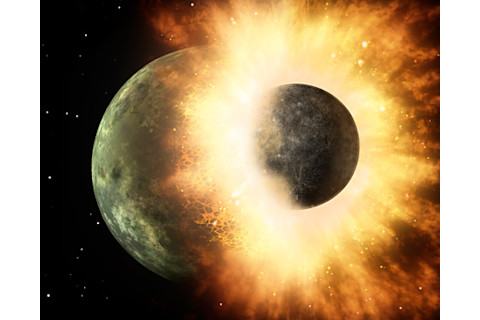 A celestial body about the size of our moon collides with a planet roughly the size of Mercury in a new artist's conception.