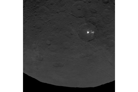 A closer look at those mysterious bright spots. (Credit: NASA/JPL-Caltech/UCLA/MPS/DLR/IDA) Scientists believe a highly reflective substance — ice or salt are leading contenders — is responsible for the spots, but they are still considering other options (a thriving alien metropolis is probably not one of them). Thankfully, Dawn is equipped with an infrared mapping spectrometer that can identify minerals based on the way they reflect light. As scientists get more images and data from Dawn, they’ll certainly learn more about the composition of those spots.