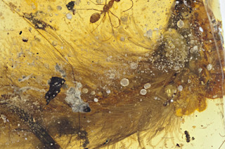 A stunning piece of amber, mined in Myanmar, preserves the partial tail of a feathered dinosaur, ants and a beetle from the middle of the Cretaceous Period, about 99 million years ago. Credit: Royal Saskatchewan Museum (RSM/R.C. McKellar). Pretty. So pretty. Pretty to look at and pretty significant: for the first time, researchers have got their hands on the tail of a non-avian feathered dinosaur preserved inside a piece of amber for almost 100 million years. Unlike dinosaur fossils found in sedimentary rock layers, this little beauty isn't squished flat, which allows paleontologists to study the tail as it was in life. Another bonus: the amber appears to have preserved components usually lost to the ages, including what may be residual iron from red blood cells. But before you shriek "Jurassic Park!" hang on...That's not even the coolest thing about this find. Described today in Current Biology, the partial feathered dinosaur tail is not alone in the amber: a couple of ants and a beetle were also preserved in the ancient tree resin. And while the insects add a little ambiance, come on, it's the tail that's transfixing. It's tiny, about an inch and a half long, and likely belonged to a juvenile member of the Coelurosauria lineage. Those are the more bird-like of the theropods (bipedal carnivores). Famous coelurosaurs include T. rex, Gallimimus and Velociraptor, the latter belonging to the maniraptors, which would eventually evolve into birds. But hang on, enough with the family tree. They found a feathered dinosaur tail preserved in 3-D. This is awesome stuff, people, but don't just take my word for it. Here's the super-sciencey way study co-author Scott Persons, paleontologist at the University of Alberta, describes the amber: "Per pound, this is the most incredible fossil I have ever seen. It is just packed with stuff!" Yeah, baby.