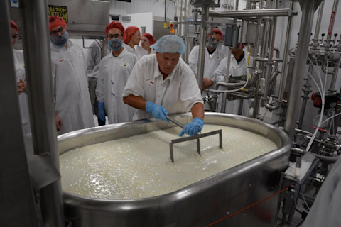 All cheesemakers first pump milk into a cheese vat and add a special enzyme called rennet. This enzyme destabilizes the proteins in the milk – the proteins then aggregate together and make a gel. The cheesemaker is essentially turning milk from a liquid into a gel.