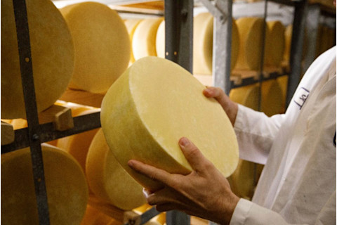 A Wisconsin cheesemaker inspects a wheel of Parmesan in the aging room. Aging is an important step in the production of many cheeses, as it allows for flavor development. (Credit: The Dairy Farmers of Wisconsin)
