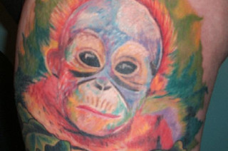 Orla writes, "I'm a Zoology undergrad in Dublin, Ireland. I got this tattoo of an orangutan to ensure that, even if they die out in the wild, which seems to be quite likely, they'll still be remembered. The noblest of the apes sits on my lap forever."