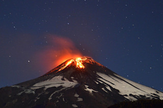 Ariel Marinkovic/AFP/Getty Images Early this morning, Villarrica in Chile produced a spectacular eruption that sent a lava fountain hundreds of meters over the volcano's summit crater (see above). The eruption spread ash over the neighboring region and an accompanying lava flow melted snow on the slopes of the volcano (see below) creating some small volcanic mudflows and debris flows. Currently, over 3,300 people have been evacuated from the small towns around Villarrica, including the vacation town of Pucón. The eruption started at ~3 a.m. (local time) and TV footage showed the deluge of lava bombs that rained down on the slopes during the peak of the eruption. The timelapse video (see below) taken by POVI shows the progression of the eruption from small explosions to the full on lava fountaining.