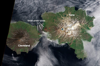 Cleveland and Tana volcanoes on Chuginadak Island in Alaska. Image taken July 26, 2012 by the EO-1 Advanced Land Imager, courtesy of the NASA Earth Observatory. Today's I'm trekking to and from Cleveland to do some lab preparation work at Case Western Reserve University. So, I thought I'd post a cool image of Cleveland volcano in Alaska as spied by the EO-1 Advanced Land Imager on July 26, 2012. Now, this image has more than just the volcano - it covers the entirely of Chuginadak Island (which apparently means "to fry or make sizzle") in the Aleutians. On the left side is Cleveland and the right side of Tana. You might also notice some small cinder cones in the area between the volcanoes. As many of you who follow Eruptions know, Cleveland is one of the most active volcanoes in the Aleutian arc today and has erupted multiple times this year, both effusively producing a dome and explosively as that dome collapses. Tana, on the other hand, has no known historic eruptions and it thought to have last erupted sometime in the last few thousand years. Luckily, no one lives on Chuginadak Island and it is remote enough that the Alaska Volcano Observatory doesn't even have a webicorder for the island (although a webcam is pointed at the volcano from Umnak Island). I had some discussion with the folks at the NASA Earth Observatory about why the area connecting the two volcanoes is so grey and some suggestions were that it could possibly be storm damage (although the elevation is likely too high for the sea to wash over) or recent volcanic products from the cinder cones - but this is far from conclusive. Remote sensing like this is one of the few ways we have to monitor volcanoes that are so far off the beaten path, but as I've mentioned before, Cleveland volcano needs to be watched due to its location under flightpaths across the northern Pacific Ocean. {Special thanks to the NASA Earth Observatory and Robert Simmon for the Cleveland image.}