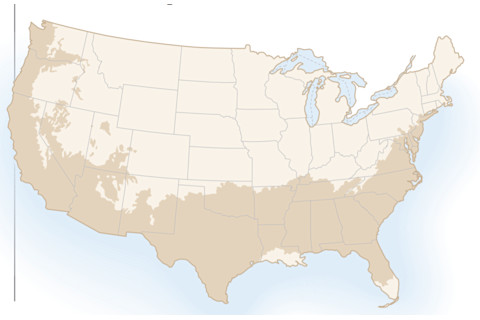 The growing zone for cork oaks cuts a swath across the southern U.S. (Credit: Jay Smith)