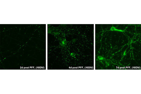There are many things you don’t want gathering in large numbers, including locusts, rioters, and brain proteins. Our nerve cells contain many proteins that typically live in solitude, but occasionally gather in their thousands to form large insoluble clumps. These clumps can be disastrous. They can wreck neurons, preventing them from firing normally and eventually killing them. Such clumps are the hallmarks of many brain diseases. The neurons of Alzheimer’s patients are riddled with tangles of a protein called tau. Those of Parkinson’s patients contain bundles, or fibrils, of another protein called alpha-synuclein. The fibrils gather into even larger clumps called Lewy bodies. Now, Laura Volpicelli-Daley from the University of Pennsylvania School of Medicine has confirmed that the alpha-synuclein fibrils can spread. Once they’ve entered a new neuron, they can corrupt the local proteins, changing their shape and gathering them into fresh Lewy bodies. They’re like gangs that travel from town to town, inciting the locals into forming their own angry mobs. This makes alpha-synuclein a bit like prions, the proteins that cause mad cow disease, scrapie and Creutzfeld-Jacob disease (CJD). Prions are also misshapen proteins that can convert the shape of their normal peers. But there is a crucial distinction. Prions are infectious – they don’t just spread from cell to cell, but from individual to individual. Alpha-synuclein can’t do that. “There is no evidence that Parkinson’s disease or other [diseases related to synuclein] can spread from person to person or from animal to person,” says Virginia Lee, who led the study. Parkinson’s may be confined to a single brain, but it can spread from one part to another. Thanks to studies like these, we know more about how this happens. “This is an outstanding study,” says Patrik Brundin, who works on Parkinson’s disease at Lund University. “It adds to the string of evidence that prion-like mechanisms play an important role in the development of Parkinson's disease.” Others studies have suggested that alpha-synuclein fibrils can seed new clumps of diseases proteins in healthy cells. In 2008, two teams showed that normal fetal neurons develop Lewy bodies if they’re transplanted into the brains of a Parkinson’s patient. A year later, other groups showed that if you can shunt alpha-synuclein fibrils into new cells, they create more fibrils. But all of these studies either forced the fibrils in, used massive concentrations of them, or exposed neurons to the fibrils amid a cocktail of other chemicals. Volpicelli-Daley wanted to see if the fibrils can spread their corruption under natural conditions that better mimic the brains of Parkinson’s patients. They could. Neurons will happily absorb alpha-synuclein fibrils at normal concentrations. Once inside, they start gathering the local synuclein proteins into fibrils along the stem of the neuron. After a few days, the fibrils move into the heart of the cell, where they create Lewy bodies (note the spread of the green dye in the image above). The cell fails, and eventually dies. “We never expect that it worked so well,” says Lee. “I like the paper very much,” says Eliezer Masliah, who studies rogue proteins in Alzheimer’s disease. However, he points out that alpha-synuclein fibrils aren’t normally found in the space between cells, so it’s not clear if neurons would have any fibrils to absorb in real life. “There is a question of physiological relevance,” he says, “but it’s possible that very small fragments of fibrils might be released from dying neurons.” It’s valuable to get clues about how synuclein fibrils spread, but Vopicelli-Daley has done something far more important – she has developed an easy system for studying that spread in the lab. Her experimental set-up is easy to run at a large scale. She’s now in a good position to look at why neurons absorb the fibrils (no one knows), how the Lewy bodies form, how they kill neurons, and how different Parkinson’s genes influence these events. She can also scan large libraries of chemicals to search for drugs that can stop the spread of synuclein. More broadly, Vopicelli-Daley’s study supports the idea that the spread of rogue proteins is a unifying feature of many brain diseases. Clusters of misfolded Tau and amyloid beta – proteins involved in Alzheimer’s – can instigate fresh clusters in new cells. And as I’ve written about before, a twisted version of SOD1, which causes Lou Gehrig’s disease, can travel from cell to cell and nudge normal proteins into adopting its malformed shape. All these varied diseases could be caused by molecular evangelism gone wrong. Reference: Volpcelli-Daley, Luk, Patel, Tanik, Riddle, Stieber, Meaney, Trojanowski & Lee. 2011. Exogenous a-Synuclein Fibrils Induce Lewy Body Pathology Leading to Synaptic Dysfunction and Neuron Death. Neuron http://dx.doi.org/10.1016/j.neuron.2011.08.033More on neural diseases: