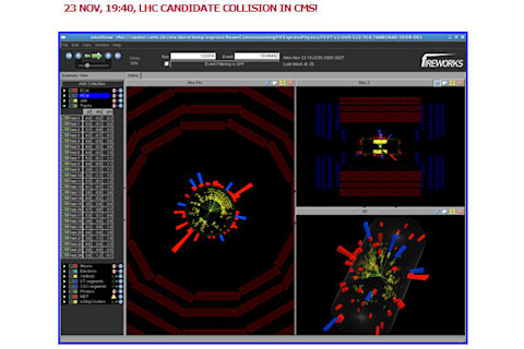 We've been waiting decades for this and here it is - first collisions at the LHC! WooHoo! The ATLAS detector saw the first collision this afternoon, followed soon by CMS. The machine was then tuned to give the LHCb and ALICE detectors collisions this evening, so all 4 experiments have had a taste of the fruit. The machine energy is set to the injection energy, 450 GeV per beam, which is a very safe way to start. They expect to ramp up to 1.2 TeV per beam to achieve the world's highest energy collisions just before Christmas. Here is the event display for the first collision in CMS: