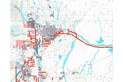 Road closures in Weld County are shown in red. The blue shows the extent of water in a 100-year flood. The city at the confluence of two rivers is Greeley. (Source: Weld County Office of Emergency Management) This map shows the 100-year flood extent for creeks and rivers in Weld County. (In other words, the extent of a once-in-a-hundred year flood, in light blue.) The South Platte River comes in from the south and is joined by the Cache La Poudre River by the city of Greeley.