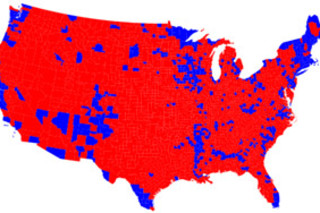 Over the past few years we've all heard about "Red" and "Blue" America. Pundits like David Brooks have written about how the two Americas are drifting apart through residential segregation in the real world or reading their own ideological media in the cyberworld. But over the past six months I've been involved in some political volunteer work relating to a local issue and I've seen voter lists with party registration, and I was struck by the number of Democrats and Republicans who lived in the same household! Husbands and wives, parents and children, and so on. There has always been a large literature on interfaith and interracial families, but have there been studies on the number of interpolitical families? We know that whether you have a gay family member or friend is a strong predictor of a more tolerant outlook toward homosexuals, how much does daily interaction with the political Other mitigate partisanship? Update: This is the source of the map.
