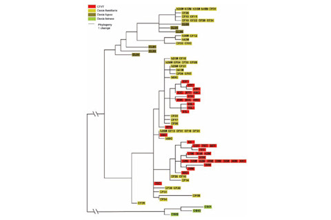 Parasites come in many forms, including bacteria, viruses, fungi, worms and more. But a very different sort of parasite is infecting dogs around the world. It’s a contagious cancer. CTVT, or canine transmissible veneral tumour, is a cancer that has evolved into an independent global parasite. Most cancers (including those that affect humans) aren’t contagious. Although some infectious diseases can lead to cancer, you cannot actually catch a tumour from someone who has one. But CTVT is an exception – the cancer cells themselves can spread from dog to dog, through sex or close contact. A Russian veterinarian called Mstislav Novinsky first discovered the disease in the 1870s, but it took 130 years for others to discover its true nature. In 2006, Robin Weiss and Claudio Murgia from University College London compared CTVT samples from 40 dogs across the world. All of them carried distinctive genetic markers that set them apart from the cells of their host dogs. They all had a common ancestor – an ancient tumour that escaped from its original host and took the world by storm. CTVT is one of two types of contagious cancer. The other plagues Tasmanian devils and might drive them to extinction. While this second type is confined to Tasmania, CTVT has become a global success story. Hopping across continents on the bodies of dogs, this cancer cell has become an immortal parasite. The ones that Novinski studied in the 1870s were probably largely identical to the ones that Weiss and Murgia looked at 130 years later. But this immortality comes at a price. The contagious cancer sometimes gets a glitch in its power supply, and it has to swap to a new set of batteries. Claire Rebbeck from Imperial College London has found that as the cells spread, they can pick up small structures called mitochondria. These are the batteries that provide our cells with energy, and the tumours can replace their set by raiding their hosts. Mitochondria have their own small genome. Rebbeck looked at these little sets of DNA in 37 CTVT samples from four continents. Like Weiss and Murgia before her, she found that the cancer cells had mitochondrial DNA that was very different to that of their hosts. This shows, once again, that the tumours had spread from dog to dog, rather than rising up independently in each animal. But Rebbeck also found that her mitochondrial sequences were far more diverse than she expected. When she drew a family tree of their evolutionary relationships, she found that the samples fell into two big closely related groups, with three black sheep that sat on their own (see the red boxes below). And when she did the same thing using DNA from the tumours’ main genomes, she got a different pattern. This strongly suggests that the contagious cancers are occasionally picking up mitochondria from their hosts. They have done this many times, ever since the original cancer cell broke free for a life of independence. This probably happened around 10,000 years ago, although the ancestor of today’s tumours probably arose just 250 to 2,500 years old. That still makes CTVT the oldest lineage of mammal cells still around. Why do the cancer cells need new mitochondria? Rebbeck thinks that they burn a lot of energy, and their DNA has a habit of changing quickly. Many of these changes will be harmful. If the cancer cells were confined to the same place, the weaker ones would eventually be weeded out. But that’s not the case – they can go on the move, taking their increasingly hobbled mitochondria with them. The solution: steal fresh mitochondria from a new host. CTVT is well placed to do this, because it evolved from an immune cell called a histiocyte, which can swallow things around it. This story is about more than just a fascinating contagious cancer. It also reminds us about the importance of mitochondria to animal cells, whether normal or cancerous. Last year, I wrote about a paper by Nick Lane and Bill Martin, two scientists who think that mitochondria were the key to the evolution of complex cells. Mitochondria are the remnants of bacteria that were once engulfed by an ancient cell. That’s why they have their own genome. By forming this partnership, the swallowing cell gained access to unparalleled supplies of energy, turning it from a sleek sportscar into a gas-guzzling monster truck. That, in turn, allowed it to escape the shackles of simplicity by developing more genes and experimenting with more types of genes. Every animal, plant, fungus and alga on the planet rose from the results of this old partnership. And so do contagious cancers.