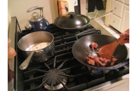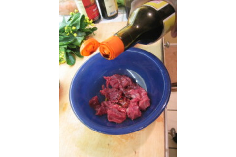 Be sure to take them out of the hot water immediately. Drain them out into a big sieve or collander, for example. Then pop a tiny amount of sesame oil (another key flavour!) into them and move them around to coat them in it. This will stop them from sticking into a huge mass. Set them aside.....we'll need them later. Remember that sesame oil? Pop a little of it into the bottom of your wok, and get it nice and hot, by turning up the flame. Pop our beef pieces into this hot oil, spread them out and leave them in for a while to brown...for a good portion of a minute (longer if your stove is low on heat output)....... turing them once after a bit, browning again.... only then get them moving for a while, keeping them moving again for another large fraction of a minute... yes, "stir-frying", and then take them out of the pan, turn off the flame, and set them aside in something.