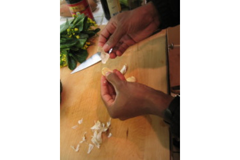 A sauce for later: Some blobs of thick oyster sauce...amazing stuff.....never ever thought of using it before. Put also in some light soy sauce.... a spoonful or two. Mix that with a cup and a half of beef stock. You've either made the beef stock yourself from tasty beef bits in an earlier session and saved it in the freezer/fridge, or you've gone and bought some off the shelf. Good to have a supply ready at all times. This time, I did not have any stored, and so I used some good off-the-shelf stuff....Trader Joe's does an excellent one, for example....it is not a specialist item. Now, another fun part. Chopping stuff up with a big knife. First, garlic. Aside: People often get troubled by garlic....getting the skin off. No problem: Just take the cloves of garlic and crush them under the knife...... then they come right off. Ta-da!