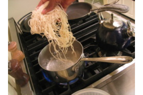 Chop 'em up nice and fine in a few seconds. That water should be boiling by now. Take your desired quantity of fresh noodles (of a type that you like....I'm using some thin, white, flour noodles...lovely and soft and floury....) and drop them gently in, perhaps adding a pinch of salt... stir and agitate them a touch with something pointy (chopsticks, spoon, whatever) to separate them... and in a very short time they'll be ready.