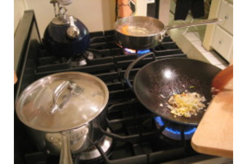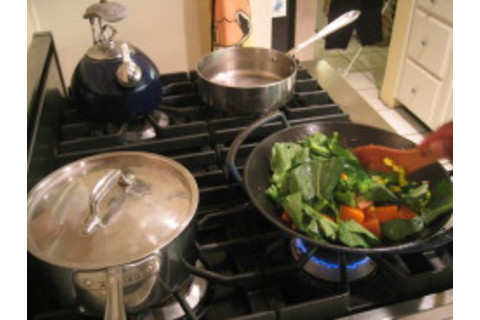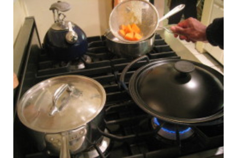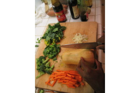 Back to chopping (I do this quickly, so if you're a slow chopper, then do all this before the cooking and frying we just did.) Chop up some carrots, some ginger (peel first and then make it finely chopped, like the garlic..you can do onions, etc here too), and then take some large chunks out of a butternut squash. (I do not peel the latter. Keep it on (wash first)...the peel is tasty.) Also chop up some green tasty leafy vegetable of choice. Leave lots of leaves whole, maybe make the stems a touch smaller and separate off. Also, some brocolli is in there too. Get another pan of water boiling for the squash (or you can steam it if you prefer) and pop them into it....with pinch of salt.