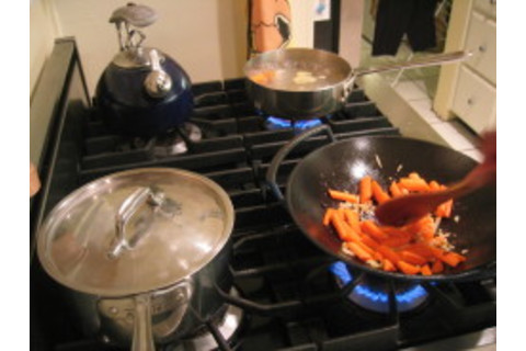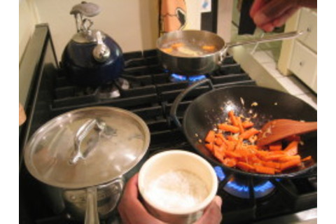 Ok, after maybe heating up a little sesame oil in the wok again (or better, just using the caramelized remainders from the beef incident, maybe loosened with a tiny bit of soy sauce), with a nice high flame: in with the garlic! let them get coated with oil and begin to cook for a few seconds and then: in with the ginger! (and onions etc, if you're using those) then: in with the carrots! Now just keep everything moving, and the flame high....