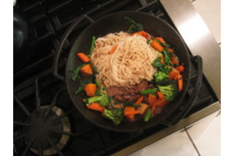 30 seconds later add in the noodles, and pour on the sauce we had aside.... this adds a nice moisture base for everything (vary quantity as desired...you can go from here to a full soup, for example, with few major changes), pop in the cooked squash.... add back in the beef. Let it all cook on low flame for a short while longer...use your intuition from your other cooking experiences and your own tastes here to determine how much you want to cook things (and how much salt, etc).....but don't over cook. You want the noodles firm to the bite, and you want the vegetables not to be soggy....they should still have a lot of firmness when you're eating them. Takes a few attempts at this to learn the tolerances and get all this right....