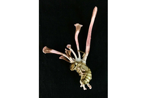 A citrus cicada nymph infected with Ophiocordyceps sobolifera. The nymph lives underground, but the fungus ensures that it ‘summits’ to just below the soil line, so that its stalks (pink) and spores find their way above ground. Matt Kasson, CC BY-ND