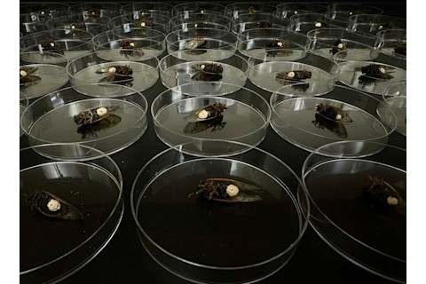 Dozens of Massospora cicadina-infected 13-year cicadas being prepared for drying and analyzing in Matt Kasson’s mycology lab at West Virginia University. Matt Kasson, CC BY-ND