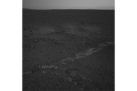 Just a few minutes ago, engineers at JPL here on Earth commanded the Mars Curiosity rovers to make its first test drive! The rover rolled a few meters, stopped and took a picture of its progress: