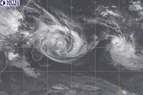 But now look at the latest Meteo France satellite image of the Southwest Indian Ocean, showing the same area as before, but with a huge Cyclone Gamede (945 millibar central pressure, a strong Category 2) in the middle of it. Technically, this storm is still at sea; but practically speaking, because it's so big, its various rainbands are already affecting Mauritius, La Reunion, and mainland Madagascar: