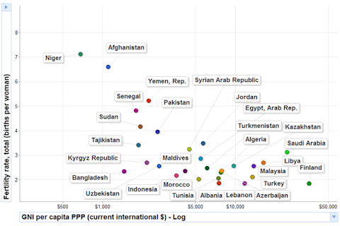 Have a good weekend. Immune Responses During Pregnancy Linked to Schizophrenia Among Offspring. This is a known association, but the interesting point is that there may be conditionalities to the response based on genetics. That would explain the heritability. 'Fused' People Eager to Die and Kill for Their Group, Research Shows. I believe that an individualist-rational focus in explaining this sort of behavior is probably not going to lead anywhere fruitful. Rather, there are group-level dynamics which are derived from psychological predispositions such as conformity. Starting with methodological individualism is necessary, but not always sufficient, to explain a human social phenomenon. Book Review: The Invisible Gorilla. "If there is one book that every human should read, it is The Invisible Gorilla, by Chris Chabris and Dan Simons." I have a copy of the book and plan on reading & reviewing it, but Jason Goldman's high opinion has moved it a bit up the stack. Indian Forces Face Broader Revolt in Kashmir. When I have suggested to Indians that they should just evacuate the Vale of Kashmir and simply hold onto Ladakh and Jammu, the response has been explosive. Though I know that there are logistical issues with retaining Ladakh while abandoning the Vale, I am to understand that those are being rendered irrelevant in the near future. So instead there are the old gems that there is going to be a positive-feedback loop of separatism if Kashmir is let go, etc. Perhaps with increased wealth Indians will have more to focus on than nationalistic concerns. Though I guess that hasn't quite worked out for China.... Fertility vs. gross national income per capita (purchasing power parity & log-transformed) for selected Muslim nations + Finland: