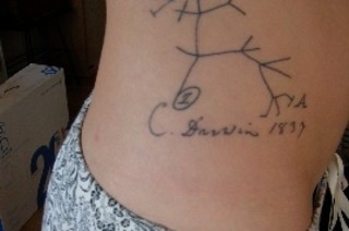 "Attached is a photo of a tattoo I got immediately after turning in the final paperwork a little over two weeks ago for the completion of my Ph.D. in biological anthropology. It's the first evolutionary tree that Darwin sketched in his 1837 Notebook B on the transmutation of species." --Julienne