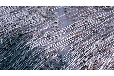 Massive trees blown down by the pyroclastic flows from the May 1980 Mount St. Helens eruption. (Credit: USGS)