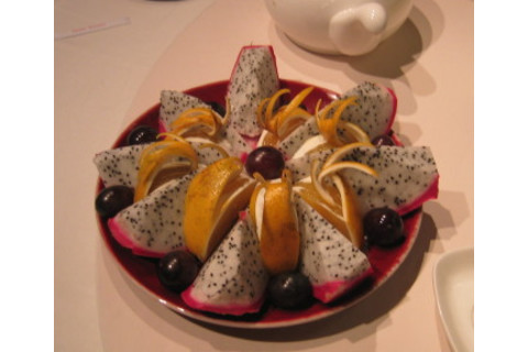 (I went there with my dear friends and colleagues Chong-Sun Chu (Durham), Keh-Fei Liu (Kentucky) and Tu-Nan Chang (USC), who are all based in non-Taiwan institutions (although Tu-Nan is directing the National Center for Theoretical Sciences I told you about earlier.) Here's an arrangement of fire-dragon fruit brought to the table at the end of a banquet-style meal at an excellent tradiational-style restaurant (see below) in Hsinchu. Just a wonderful fruit, with gorgeous patterning and colouring, don't you think? And delicious!