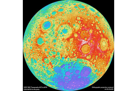 [Over the past few weeks, I've collected a metric ton of cool pictures to post, but somehow have never gotten around to actually posting them. Sometimes I was too busy, sometimes too lazy, sometimes they just fell by the wayside... but I decided my computer's desktop was getting cluttered, and I'll never clean it up without some sort of incentive. I've therefore made a pact with myself to post one of the pictures with an abbreviated description every day until they're gone, thus cleaning up my desktop, showing you neat and/or beautiful pictures, and making me feel better about my work habits. Enjoy.] The Lunar Reconnaissance Orbiter, one of my favorite space probes ever, takes amazing high-res pictures of the lunar surface. But more than that, it can map the elevations of lunar features using shadows as a guide. Knowing the angles of the Sun, the Moon, and its viewing position, it can accurately gauge the elevations of the Moon's surface as it takes image after image, orbit after orbit. The scientists on LRO used that information to put together a wild topographic map of the Moon's far side: