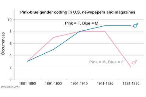 Five years ago I blogged about the debate over whether the blue-for-boys, pink-for-girls color convention used to be the other way around. My post focused on a 2012 paper by psychologist Marco Del Giudice arguing that the idea of a cultural "pink–blue reversal" in the English-speaking world in the early 20th century is a myth. Now, Del Giudice has published an 'update' revisiting the issue. Based on text data from late 19th and early 20th century American newspapers and magazines, Del Giudice says that there's still no evidence that pink-for-boys, blue-for-girls was ever the dominant pattern. Del Giudice admits however that the periodicals do reveal that in the period before 1920, both blue-for-boys, pink-for-girls and the reverse scheme were mentioned, roughly equally often. In other words, the genders of these colors were inconsistent before this point.