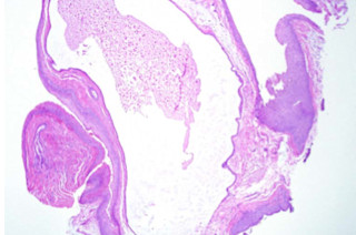 "A cyst is present in Reinke's space in a true vocal cord biopsy.It contains mucus inspisated in a shape resembling a puppy (Figure 1). The cyst is lined by columnar epithelium (Figure 2). We diagnosed it as a Mucus Retention Cyst of the Vocal Cord. Mucus retention cyst of the true vocal cord arises from a blocked mucus-producing gland in this area."