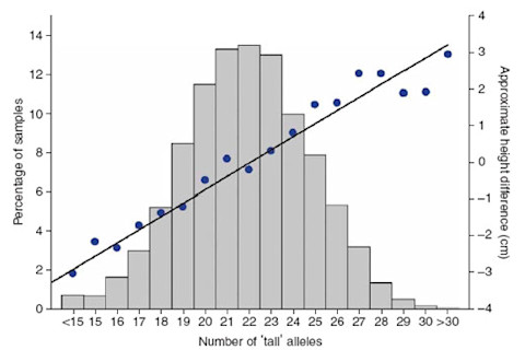 My discussion with Jim Manzi on epistasis generated a lot commentary. It's a complex topic, as I said there are different ways to define epistasis, and evolutionarily its effect on trait value might be different from its effect on fitness. Finally, I think it is important that epistatic and additive genetic variation can convert from one to the other; and over the long term it is this heritable variation which is the "stuff of evolution," so to speak. But a friend recommended that I post a figure from Genome-wide association analysis identifies 20 loci that influence adult height.