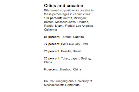 I've been reading a good deal about the effects of cocaine on the human body as I enter the homestretch of composing my next book, which also involves the stimulation of similar pleasure centers of the brain. That said, you can imagine my interest in the topic of Yuegang Zuo's talk at the national meeting of the American Chemical Society: His research estimates that 90 percent of U.S. bills carry traces of cocaine. Now don't be alarmed. Cocaine binds to the green dye in money and a good deal of cross-contamination happens when bills get whisked through ATM machines. So we're talking about very small trace amounts--not enough to put your health at risk. Still, the findings of this study out of the University of Massachusetts Dartmouth cast an intriguing light on how easily we come into contact with drugs, germs, and more as we course about our daily lives. Percentages of contaminated bills vary by location and Zuo plans investigate whether his data can illustrate cocaine use regionally. Read more at CNN...