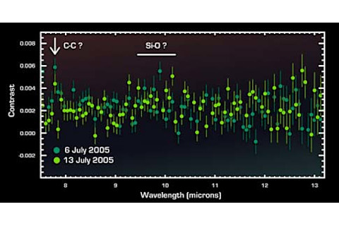 So what did they see? Perhaps the biggest thing is what they didn't see: water! Theoretically, water (actually, steam; these planets are hot) should be present in the planets' atmospheres, and should have been really obvious. Water is excellent at absorbing infrared light (it's a greenhouse gas, after all) and so the presence of water would have been revealed by dips in the spectra at specific wavelengths. They saw nothing like that! Does this mean there is no water in the planets' air? Not necessarily; more likely the water is lower down in the atmosphere, and is covered by high altitude dry clouds of some other chemical, and the light is blocked. This is supported by the detection of silicate dust in the atmospheres. This means the planets have a high layer of dust surrounding them, unlike any planet in our own solar system. So that's pretty interesting as well. Not only that, they found a feature in the spectrum at 7.8 microns they can't identify! That's unusual, and they need to take more observations to try to nail that down. One more thing, and to me it's the most fascinating result they found. The shape of the spectrum can tell you a lot as well. These planets are so close to their parent stars that they are tidally locked