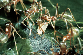 Renowned sociobiologists and ant experts E. O. Wilson and Bert Hölldobler go so far as to call the most advanced insect societies—like the leaf-cutting ants, which cultivate fungus in air-conditioned nests with their own hygiene and waste disposal systems—“civilized.” It’s hard to disagree, although these civilizations are more Alien than Star Trek, dark and squishy worlds with buildings made from living bodies or stitched together by workers using silk-extruding grubs as sewing machines. Communication is mostly by smell, and it is staggeringly efficient: A milligram of a pheromone that ants use to mark their paths would lay a trail 60 times around the earth.