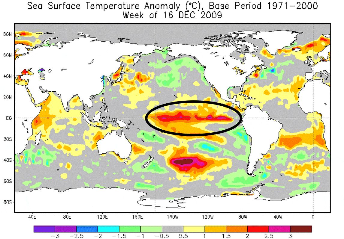 To my eye, even the tropical Pacific waters aren't looking so El Niñoish right now. You can check it out in the animation at the top of this post. It shows what a bona fide El Niño looks like compared to El Limbo. Look closely at the area I've circled east of the International dateline and west of South America. The first frame in the animation shows how sea surface temperatures in the tropical Pacific Ocean departed from the long term average during the week of Dec. 16, 2009. A moderate El Niño was underway at that time. What do you see? Relatively warm sea surface temperatures in that region — typical of El Niño. The second frame shows sea surface temperature anomalies for the week of Jan. 1, 2015. Where has all the sea surface heat gone? Into limbo, I'm guessing... Lastly, I really want to give credit where credit is due: I did not come up with the "El Limbo" idea. I saw it first on this post about El Niño by Elisabeth Gawthrop. Nice!