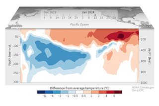 Water temperatures between December 2023 and January 2024 in the top 300 meters (1,000 feet) of the tropical Pacific Ocean, compared to the 1991–2020 average. (Credit: NOAA Climate.gov animation, based on data from NOAA's Climate Prediction Center.)