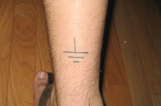 This tattoo is the schematic for the reference point of electricity. I just think of it as the source of electricity. Its really either the point at which you consider voltage to be 0, or in this pictures case, the physical connection to the earth (hence the lower calf). Electronics has been my passion for as long as I can remember, and I feel like this tattoo doesn't do it justice. So I plan on getting another one to incorporate my passion for electronics and my trans-humanism beliefs."