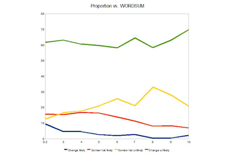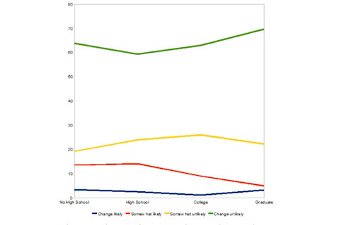 It looks to me that the low proportion who seem very changeable in their viewpoint on this touchstone cultural issue are those with less education, or lower vocabulary test scores (note that I lumped everyone who scored from 0 to 2 together since the N's here were low). So there does seem to be some suggestion here of polarization and certitude as one moves up the socioeconomic ladder in terms of an issue which is often portrayed as a black & white divide. Unfortunately, it's just one variable, and the effect is weak enough that I would want to look at others (obviously, the overwhelming number of people are rather set in their ways when it comes to their position on abortion; at least at any given time). But as I said the N's for other issues I could think of were just really small. If people can think of a way to use the GSS to expand beyond this issue, or have other data besides the GSS, I will post an update....