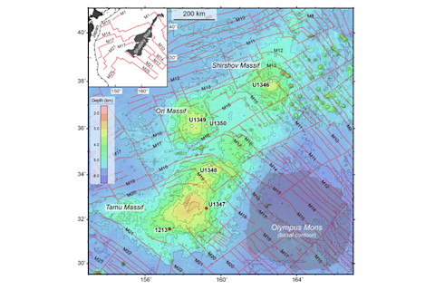Bathymetry of Shatsky Rise showing the world's largest volcano, Tamu Massif, at its southern end. A shadow basal contour of Mars' Olympus Mons appears in the lower right corner of the image for comparison. Image credit: Willam Sager, University of Houston. There's big and then there's big. And then there's Tamu Massif. A single enormous volcano under the northwestern Pacific Ocean has been found to be the largest on Earth and a rival in size to Mars' Olympus Mons, the biggest known volcano in the solar system, according to findings published today in Nature Geoscience. Tamu Massif, the oldest seamount in a formation known as the Shatsky Rise, is about the size of the British Isles. Researchers used seismic profiles and core samples to determine that Tamu Massif, rising from the ocean floor between Japan and Hawaii, is a massive basaltic shield volcano. The seamount formed about 145 million years ago at the south end of Shatsky Rise, an oceanic plateau itself about the size of California. Core samples revealed massive lava flows up to 75 feet thick on Tamu's slopes. The lava sheets had a high flow rate and low viscosity, creating the signature broad dome shape of a shield volcano (in contrast, most seamounts form through eruptions of lava with a low flow rate, which creates steeper slopes). The team also obtained seismic profiles by bouncing signals through the igneous crust to determine its depth and spread. Based on the distribution of the lava, researchers were able to determine that Tamu built up from huge eruptions at a single summit. Tamu Massif is larger than the multi-volcano complexes on the islands of Hawaii and Iceland. The oceanic plateaus of Ontong Java and Kerguelen are larger, but both are considered composite complexes with multiple volcanoes. Tamu's Martian brethren, Olympus Mons, may seem more impressive because it rises nearly 14 miles above the Red Planet's surface. Tamu Massif's summit, by contrast, is just over two miles from the sea floor. "But their volumes are comparable," notes William Sager of the University of Houston, the study's lead author. "Tamu is only about 25% smaller in volume. Tamu is like an iceberg. It is 30 km (more than 18 miles) thick with most of the bulk in the mantle, whereas Olympus formed on thick lithosphere, which supports its height." Future research on Tamu Massif will explore how such a large volume of magma formed beneath the single volcano before erupting.